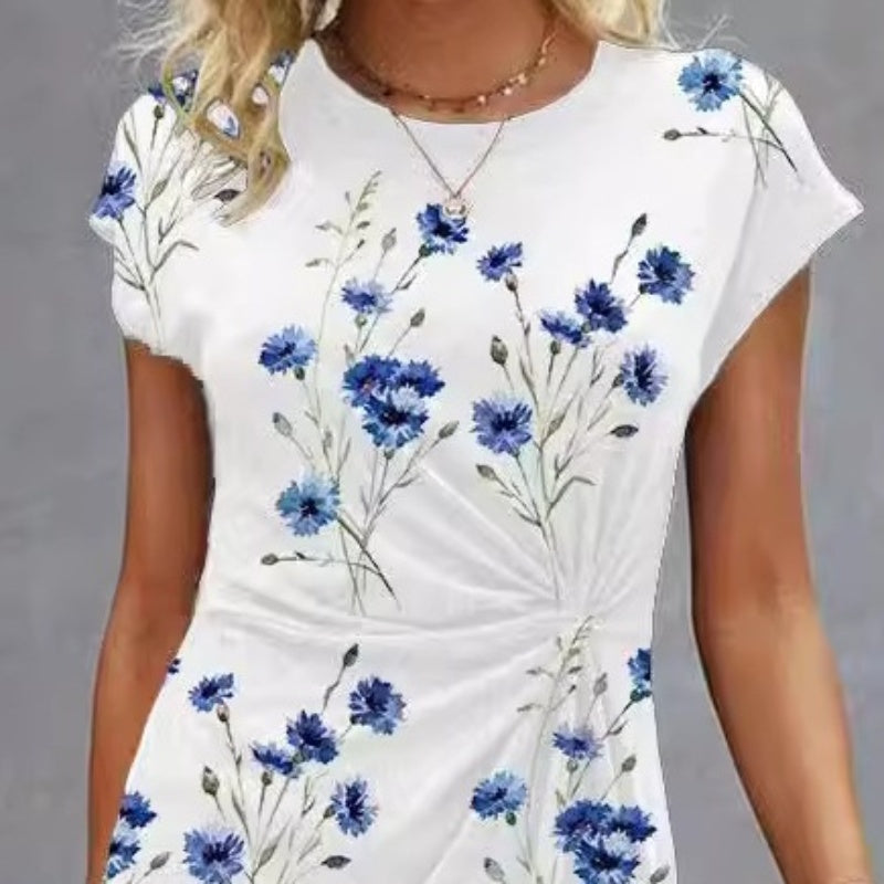 Damska elegancka sukienka z okrągłym dekoltem z nadrukiem