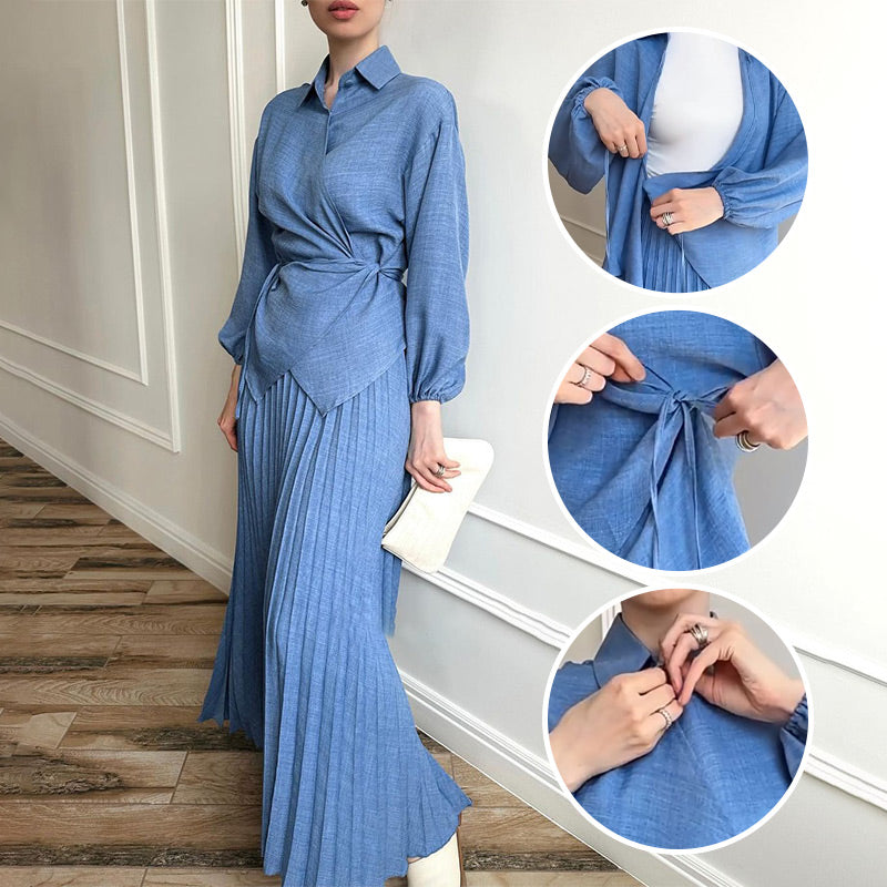 Elegancki 2-częściowy zestaw z koszulą z paskiem w talii i plisowaną spódnicą