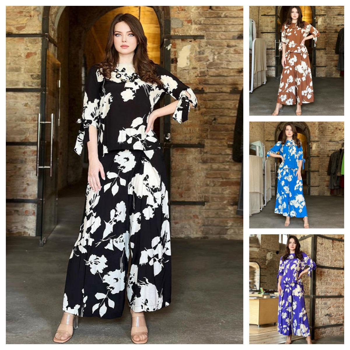 Pakiet zawiera:1*Kwiatowy top z wiązanym rękawem Spodnie z szerokimi nogawkami 2-częściowy zestaw