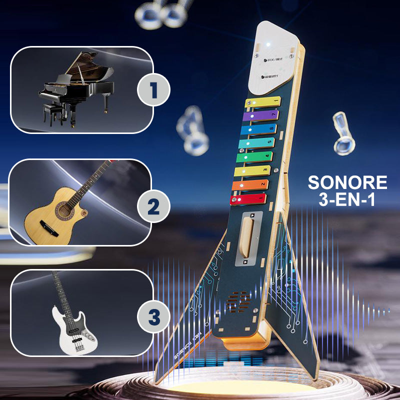 DOŚWIADCZENIE DŹWIĘKOWE 3 W 1 – Dzieci mogą odkrywać trzy rodzaje dźwięków muzycznych: bogate melodie fortepianowe, autentyczne brzmienia gitary akustycznej oraz głębokie, dźwięczne tony gitary basowej.