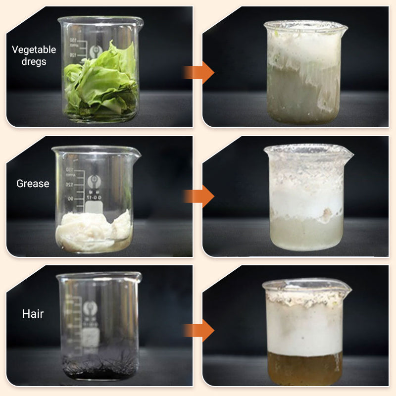 ⚠️ Produkt nie działa na zatory spowodowane przez materiały nieorganiczne, takie jak cement, metal, plastik czy piasek.