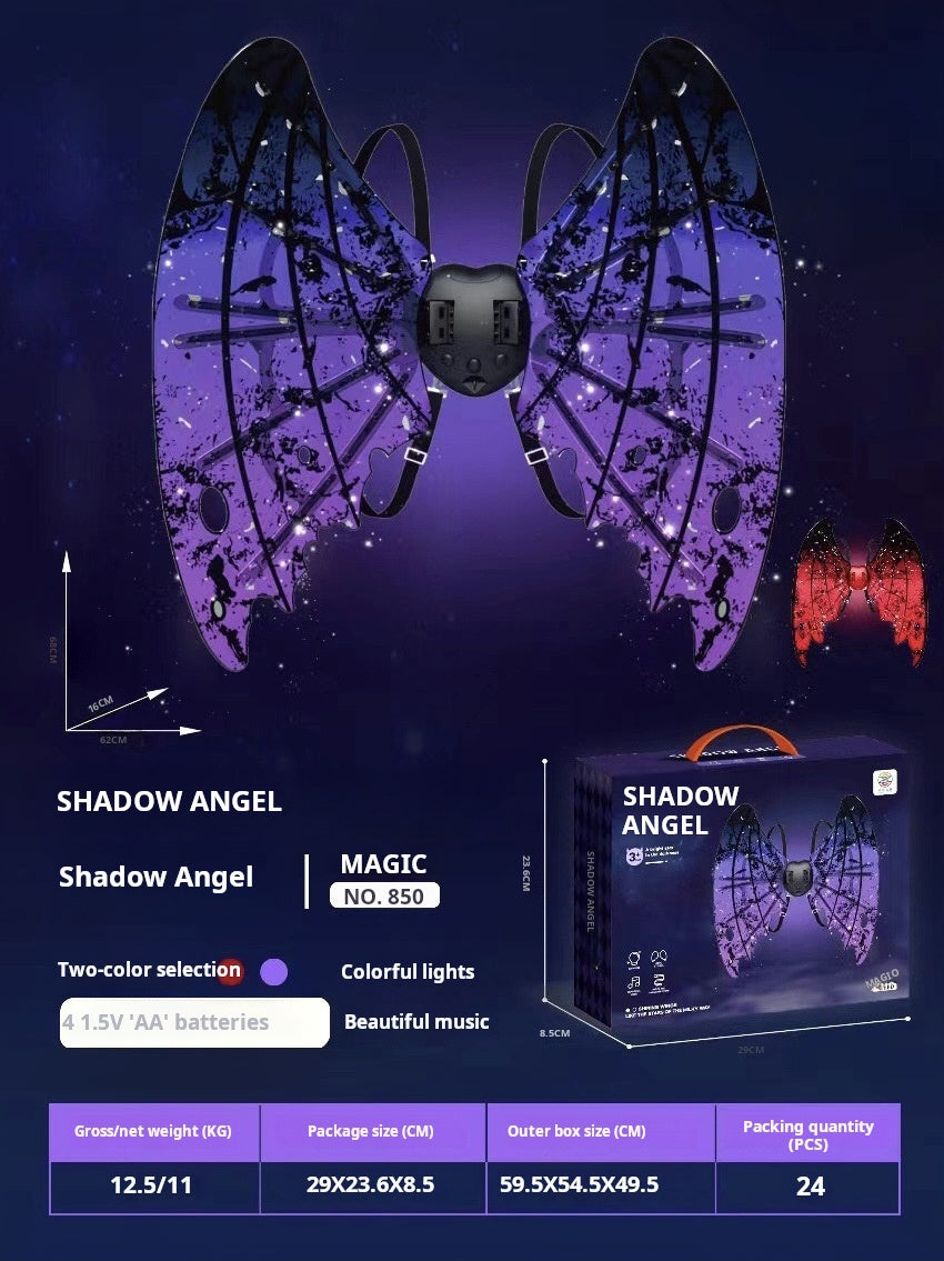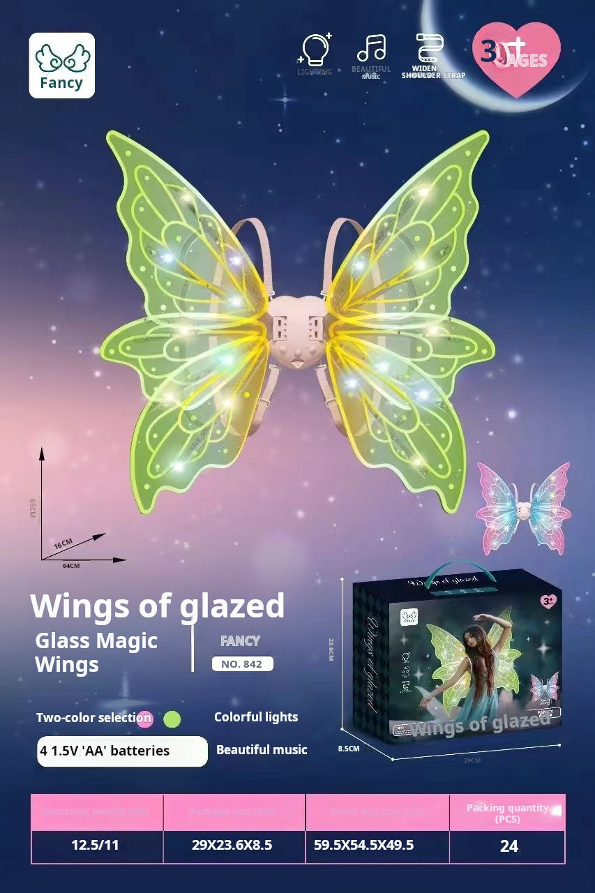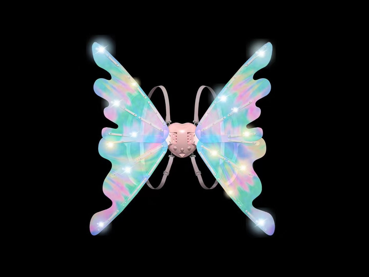 Projektant wykorzystał przezroczyste sztuczne skrzydła cykady, które są lekkie, odporne na starzenie się i blaknięcie oraz mają magiczny efekt gradientu. Dostępne są skrzydła wróżki z trybem muzycznym i cichym. Te bajkowe skrzydła motyla spełniają marzenia dzieci o bajkach.