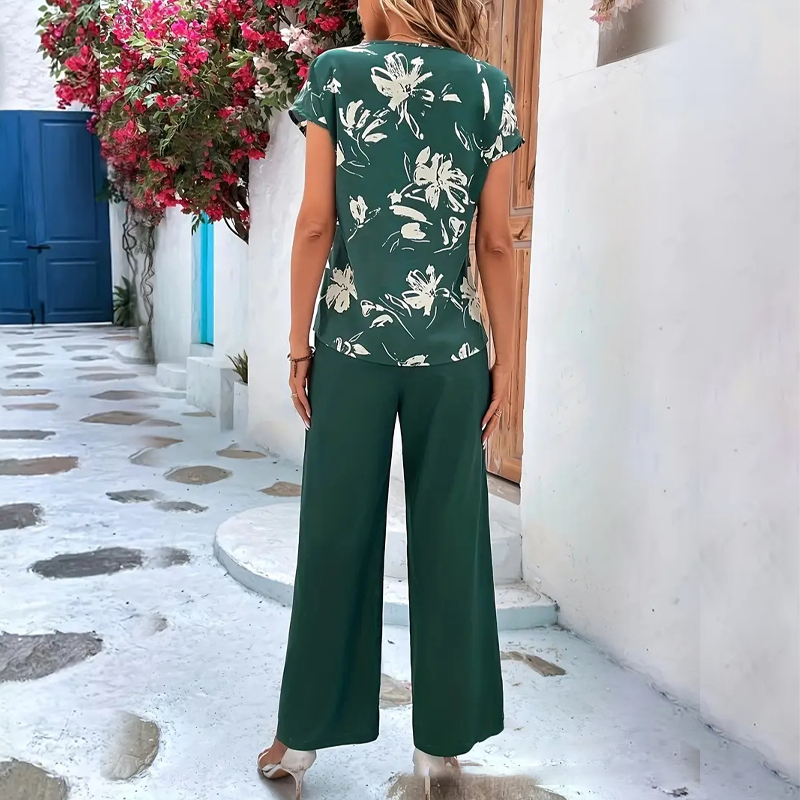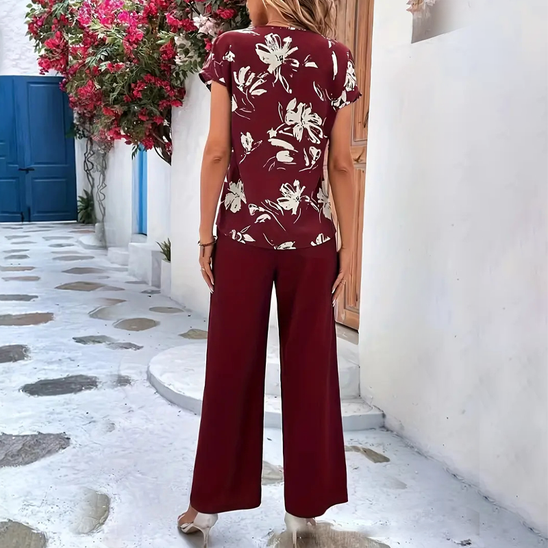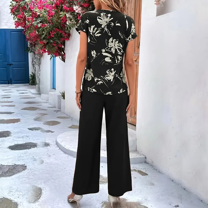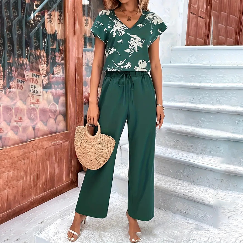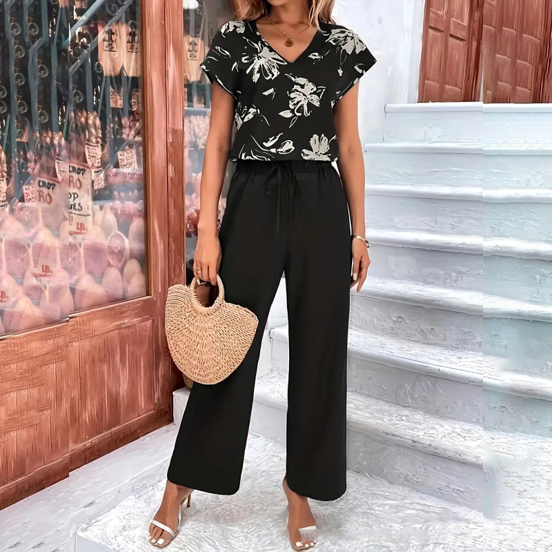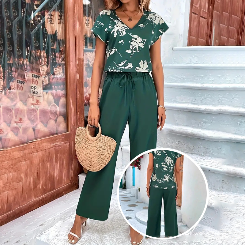 2-CZĘŚCIOWY KOMPLET ELEGANCKICH UBRAŃ: Podnieś poziom swojej codziennej garderoby dzięki temu eleganckiemu 2-częściowemu kompletowi. Atrakcyjny top z dekoltem w szpic ma żywy nadruk, a spodnie z szerokimi nogawkami zapewniają nowoczesny krój. Idealny do stworzenia eleganckiego, ale swobodnego wyglądu.