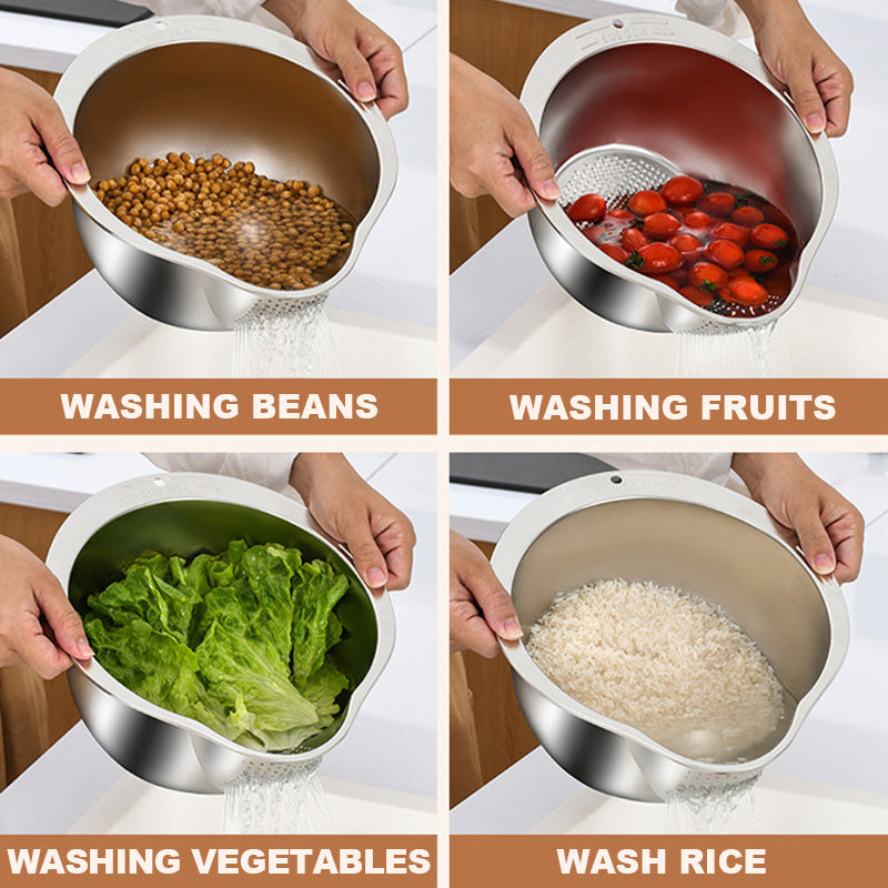 WIELOFUNKCYJNA KONSTRUKCJA: Wielofunkcyjna konstrukcja miski cedzakowej sprawia, że nadaje się ona nie tylko do przesiewania ryżu, ale także do mycia owoców, warzyw i fasoli, co czyni ją wszechstronnym narzędziem w kuchni.
