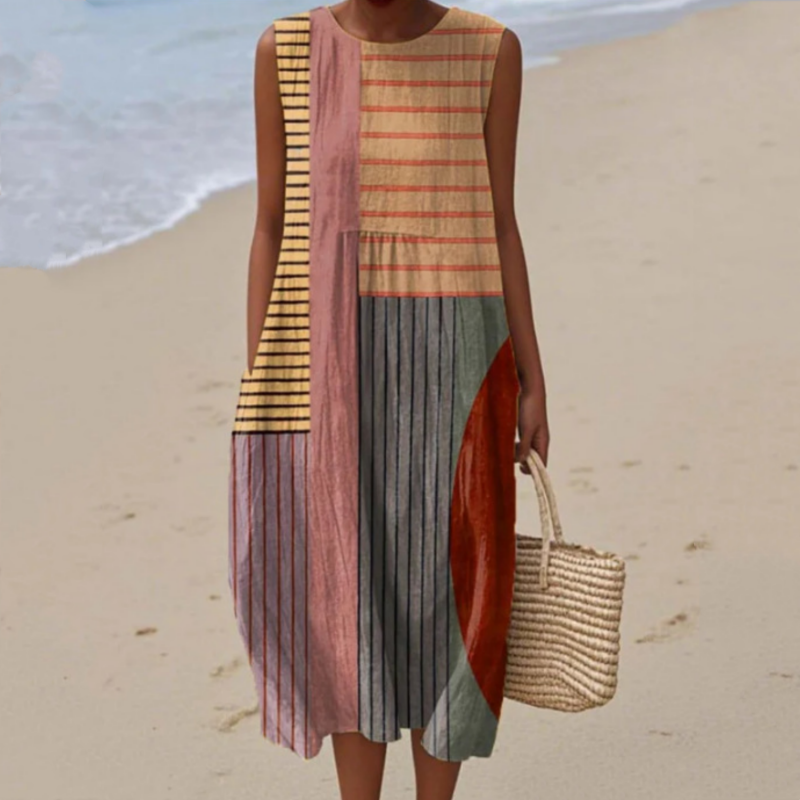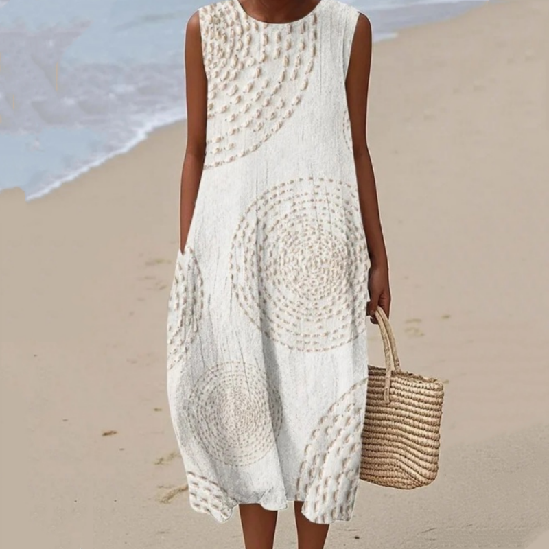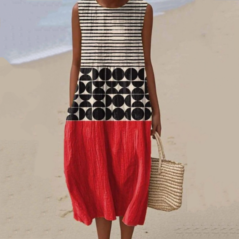 SLEEK SLEEVELESS CUT - Zaprojektowana bez rękawów, ta sukienka jest idealna na ciepłe dni. Zachowaj chłód i styl, ciesząc się swobodą ruchów, dzięki czemu jest idealna na słoneczne dni lub wakacje.